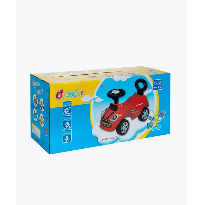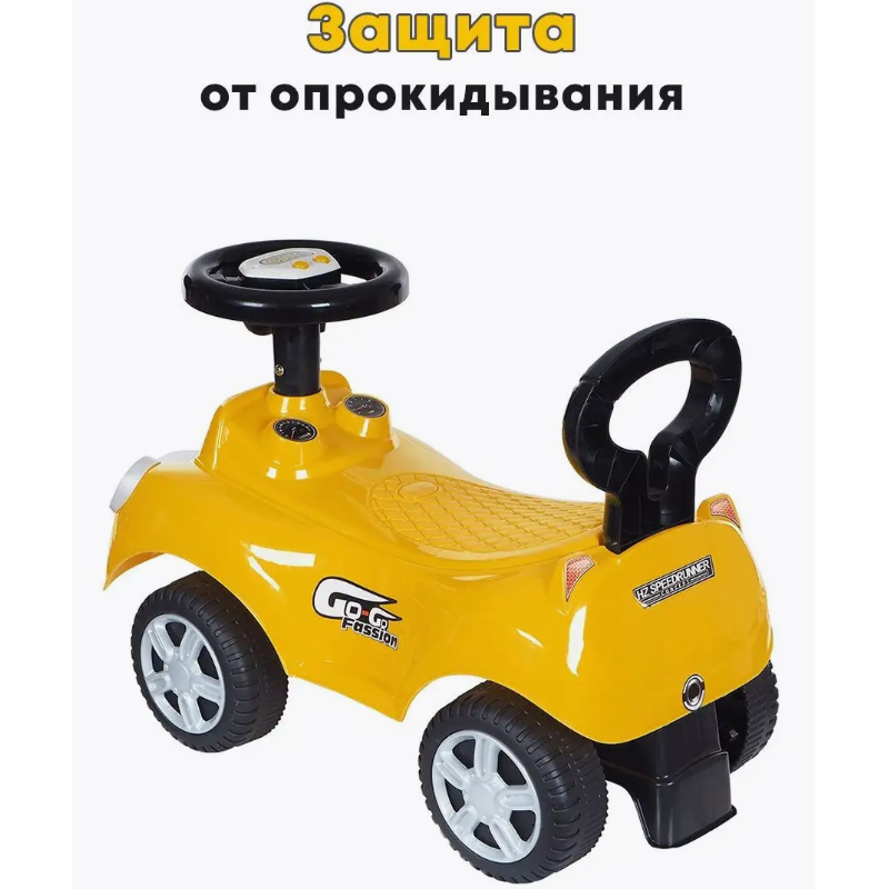 Каталка миникар порадует вашего ребенка поворотным рулем, на котором располагаются кнопки со звуками.
