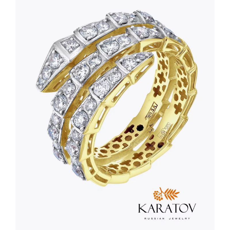 Кольцо женское выполнено из желтого золота 585 пробы с бриллиантами. Колечко с уникальным дизайном можно носить в любом возрасте, оно станет отличным украшением для женщины, девушки, а также для подростков. Золотое кольцо прекрасно сочетается с повседневными, вечерними и праздничными образами. Можно использовать на большой палец и на мизинец. Украшения бренда KARATOV - это не бижутерия. Для производства используются натуральные драгоценные металлы. Такие изделия обладают особой прочностью и долговечностью. Золото не тускнеет со временем, сохраняя ослепительное сияние и не подвержено деформации. Материал не слишком прихотлив в уходе и, если соблюдать простые правила, украшение надолго сохранит первоначальный внешний вид. Кольцо необходимо протирать раствором с добавлением мыла и очищать щеткой с мягкой щетиной. Ювелирные изделия устойчивы к царапинам, не изменят свой цвет со временем, гипоаллергенны и подойдут для людей с чувствительной кожей. Чтобы покупка радовала вас, как можно дольше, рекомендуем избегать контакта с агрессивными химическими и парфюмированными средствами. Гарантийный срок составляет 6 (шесть) календарных месяцев и исчисляется со дня получения заказа. Коллекции KARATOV - словно собрание удивительных историй, в которых каждый найдёт что-то своё. Мы воплощаем счастливые моменты вашей жизни в уникальных украшениях – это готовый подарок в брендированной упаковке для любимой, мамы, бабушки, невесты, жены и подруги. Поводом может быть любой праздник: свадьба, 8 марта, юбилей, новый год, день рождения и другие. Заявленное качество подтверждается в Федеральной пробирной палате клеймом, которое свидетельствует о подлинности и пробе изделия. Значения веса на фото и в характеристиках являются примерными и могут отличаться от фактических, которые будут указаны на бирке в комплекте с вашей покупкой.